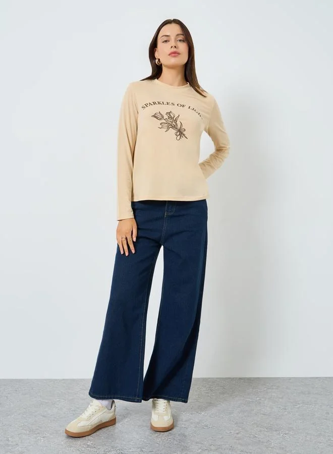 Styli Beige Graphic Print Long Sleeve T-Shirt