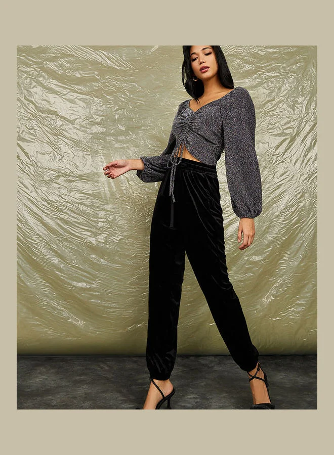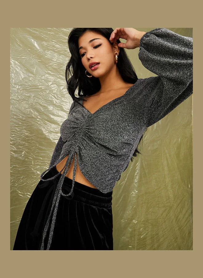 Styli Blouson Sleeves Shimmer Look Knit Top with Ruched Detail