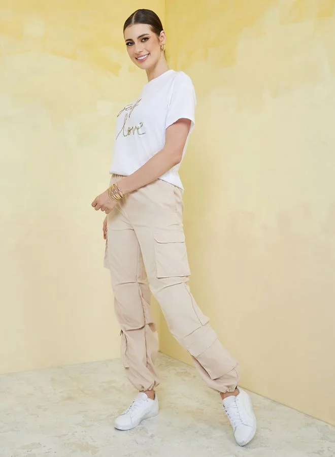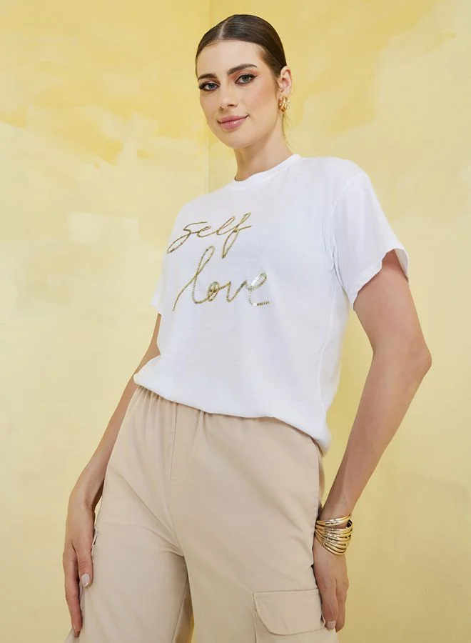 Styli Boxy Fit Self Love Sequin Slogan T-Shirt