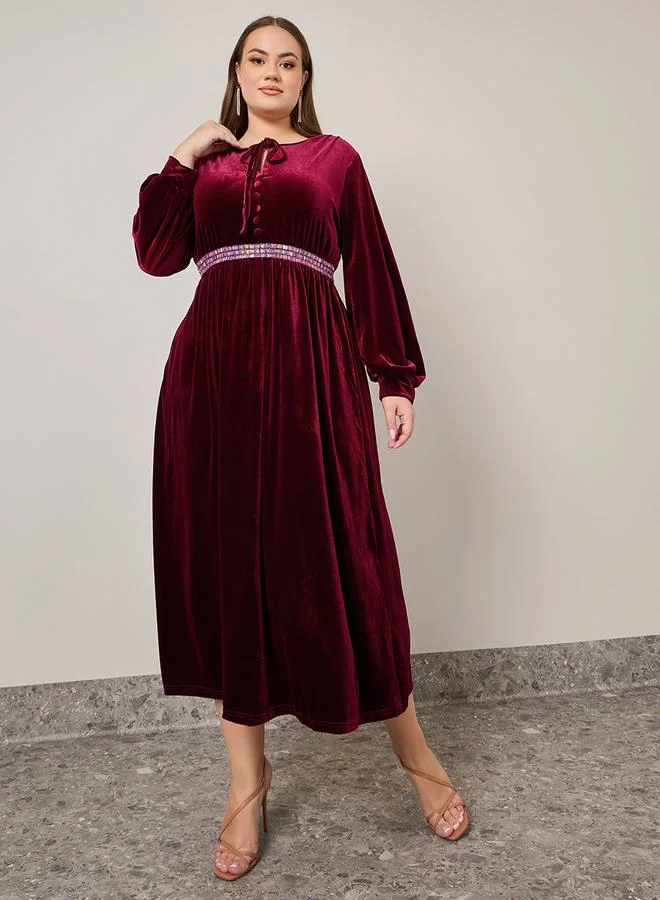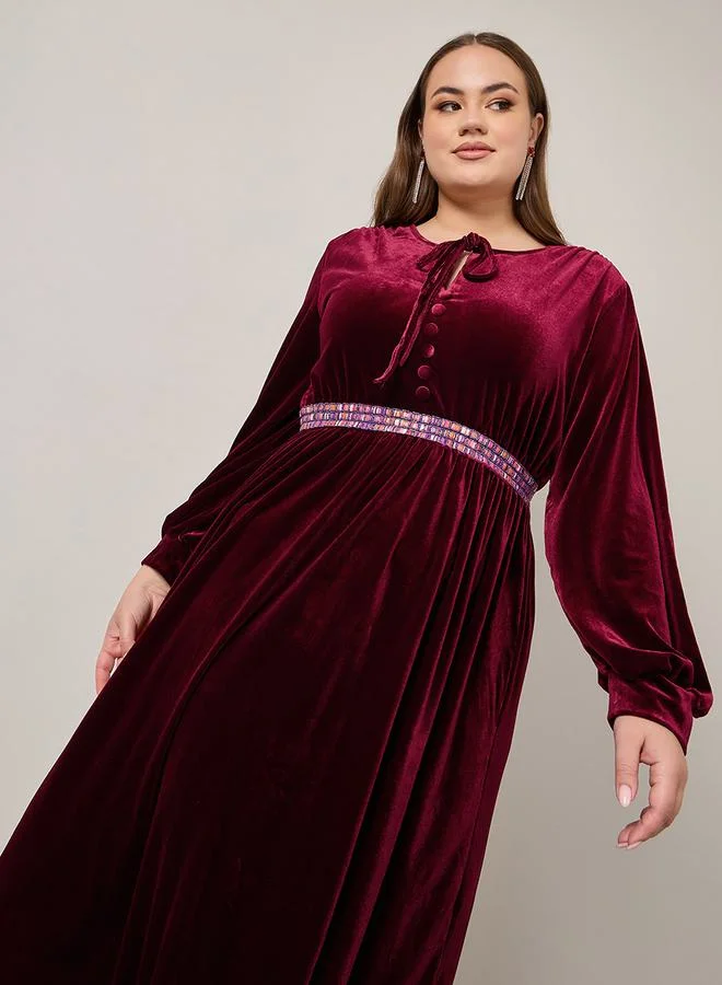 Styli Embellished Waist Detail Velvet Maxi Dress