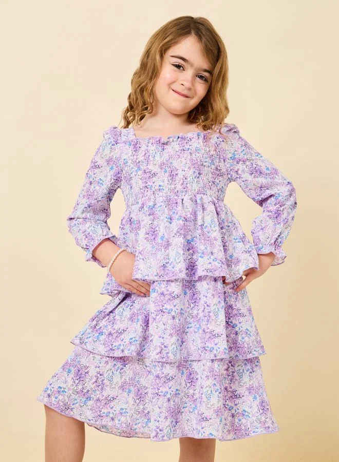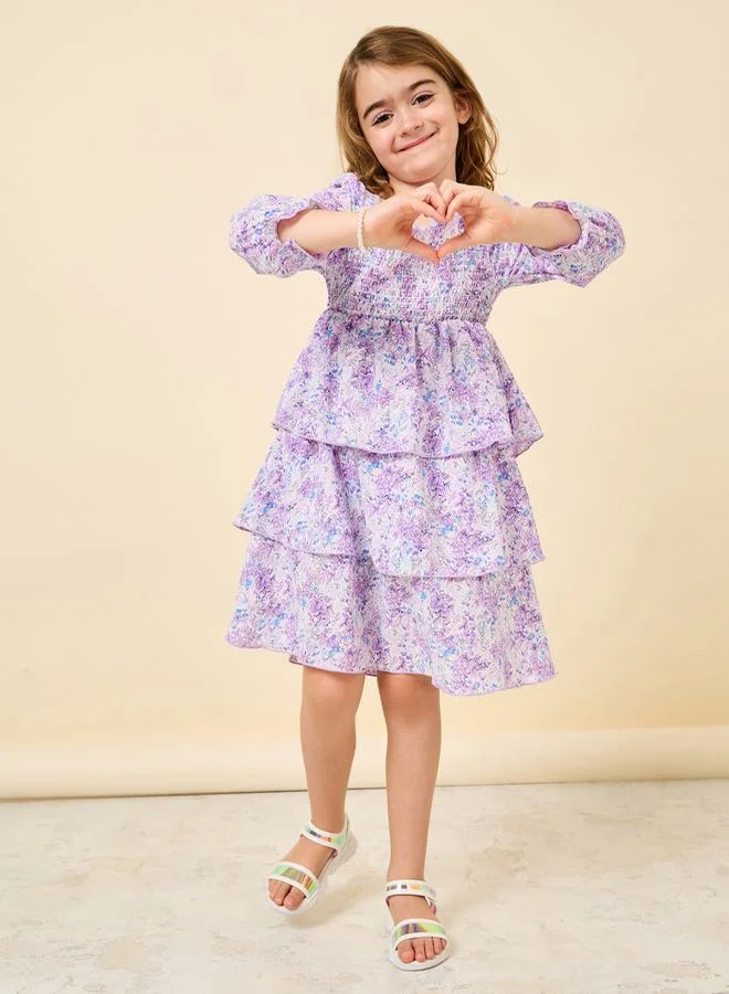 Styli Floral Printed Ruffled Dress with Puff Sleeves