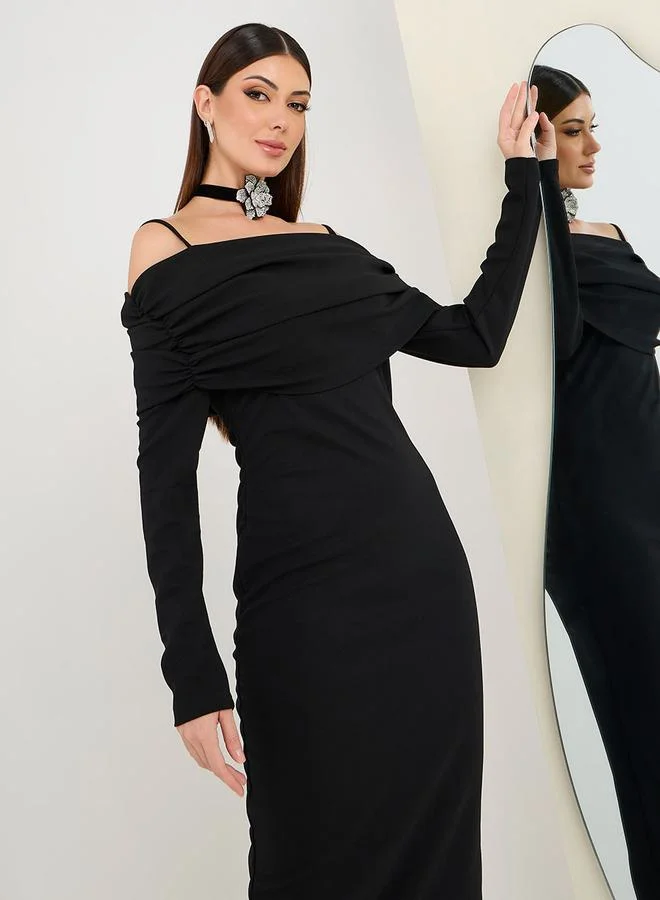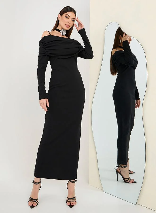 Styli Fold Over Off Shoulder Sheath Maxi Dress