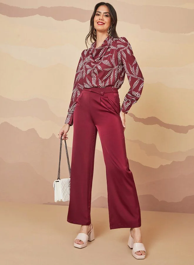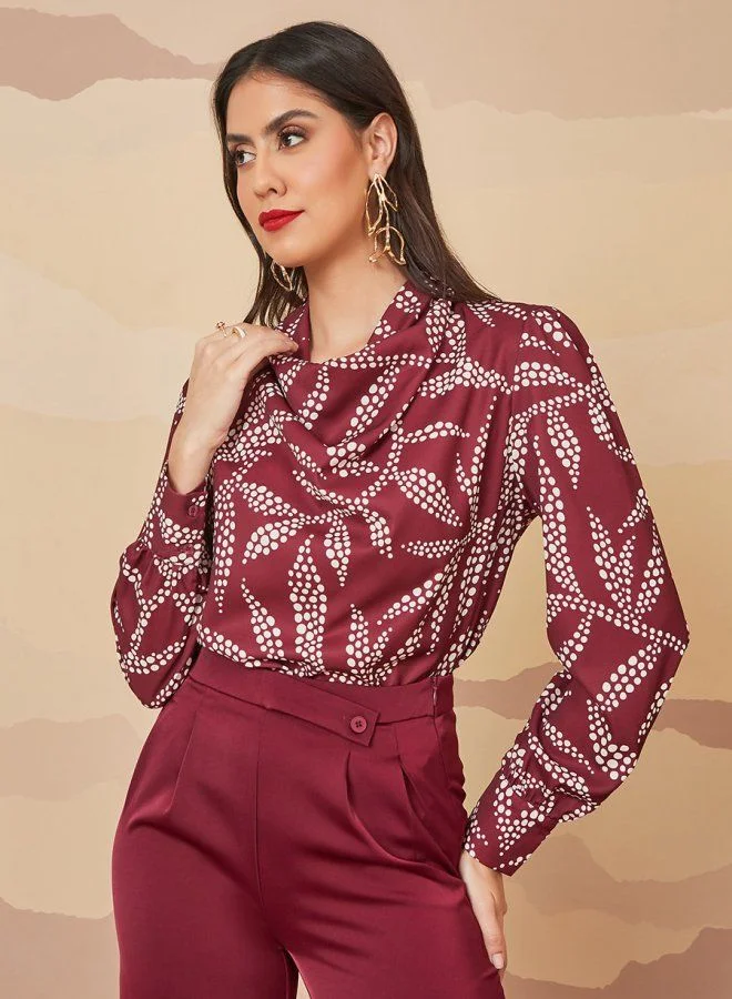 Styli Leaf Printed Cowl Neck Satin Blouse