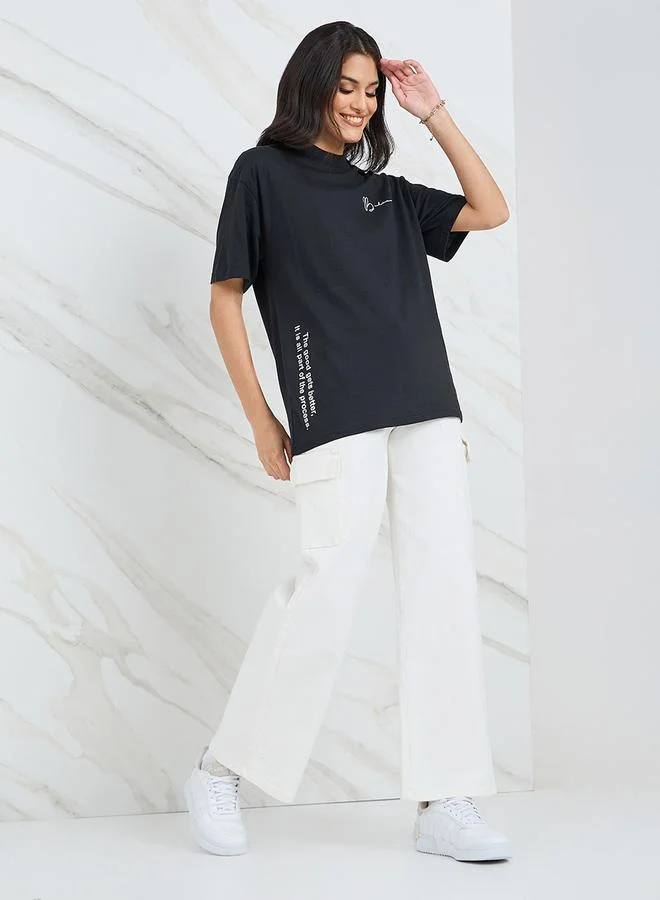 Styli Oversized High Neck Believe Slogan Longline T-Shirt