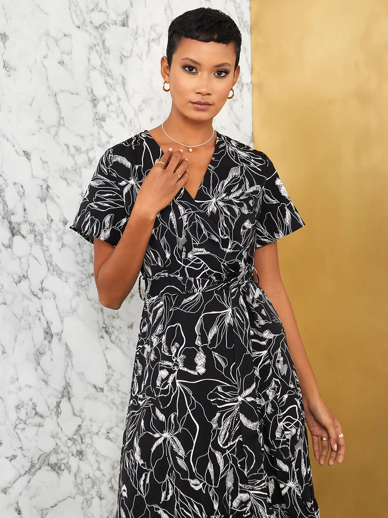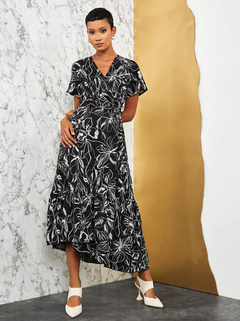 Styli Short Sleeves Floral Sketch Print Wrap Front Maxi Dress