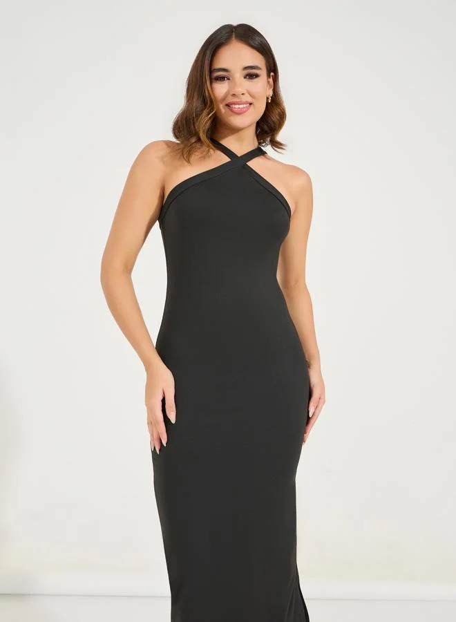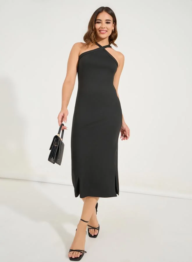 Styli Plain Halter Neck Bodycon Midi Dress with Side Slit