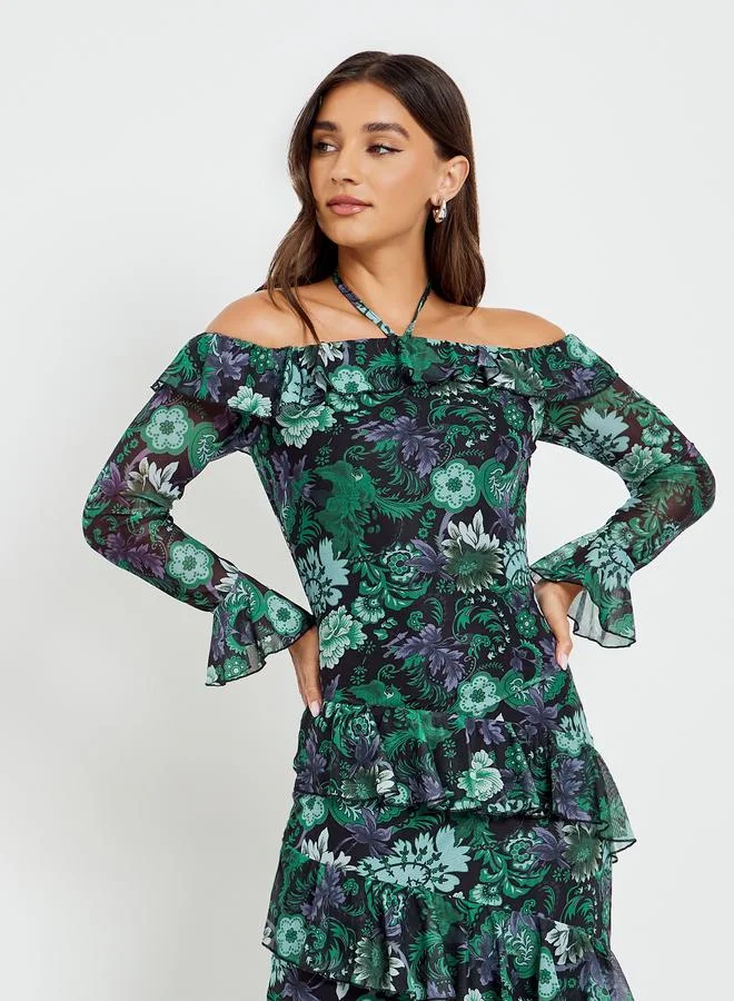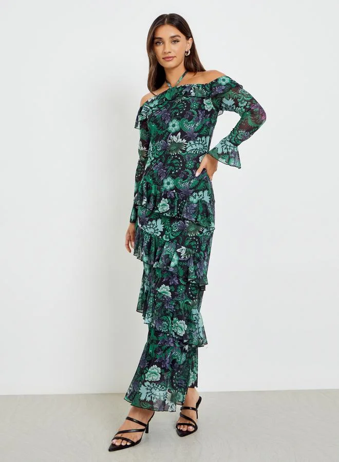Styli Women Green Printed Ruffle Detail Maxi Dress