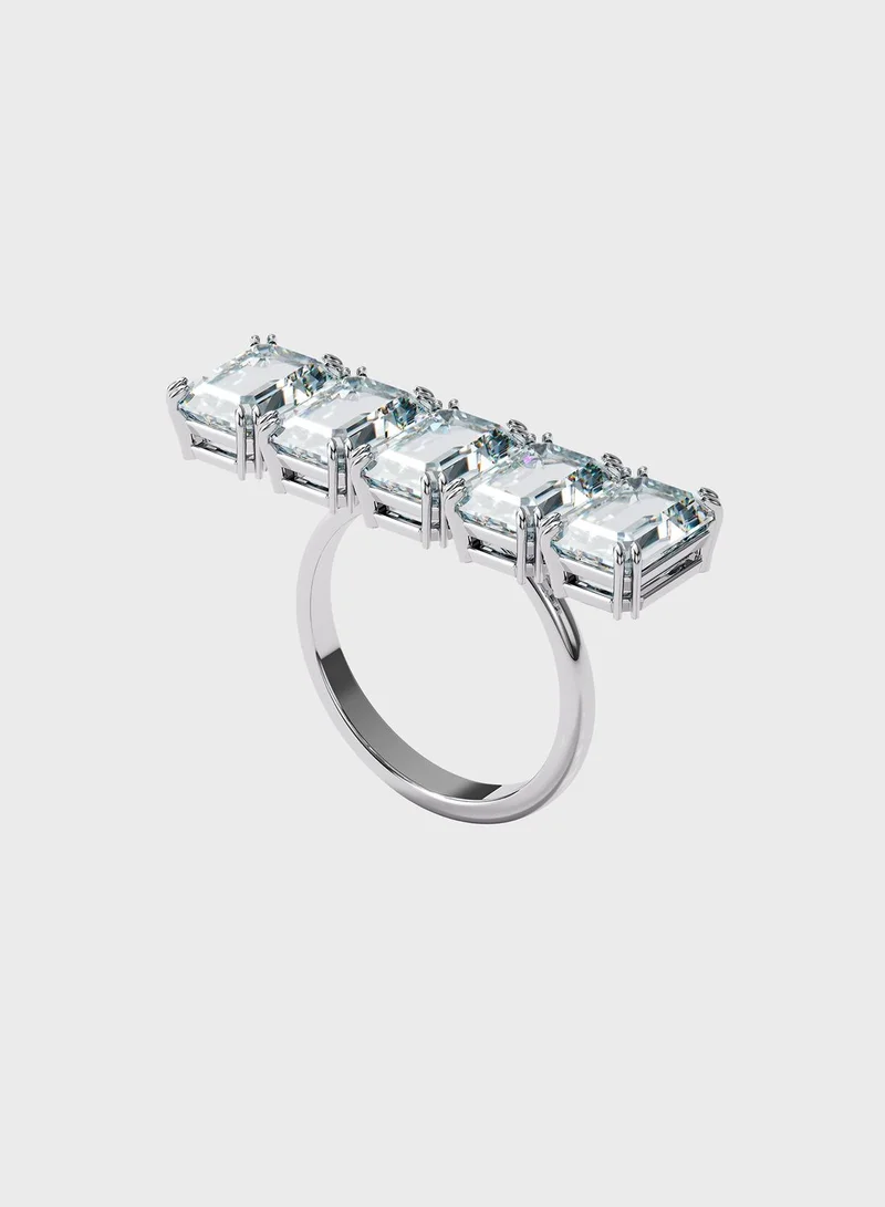 Showcasing octagon cut clear crystals in a line of rhodium plated claw settings, it can be styled with anything and everything, day or night. This ring is part of the Millenia family, designed by Creative Director Giovanna Engelbert for Collection I.