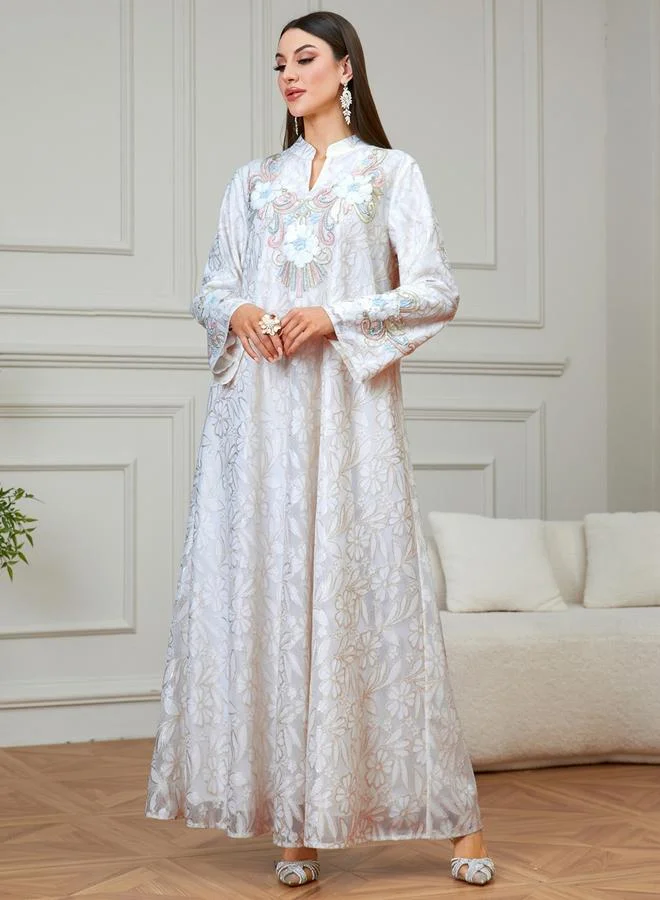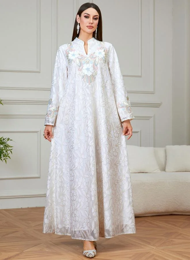 Elegant beige polyester jalabiya featuring an all-over floral embroidered overlay. Designed with a classic mandarin collar and long sleeves, this A-line maxi dress offers a modest and sophisticated silhouette. Perfect for festive daytime gatherings, combining traditional charm with modern grace.