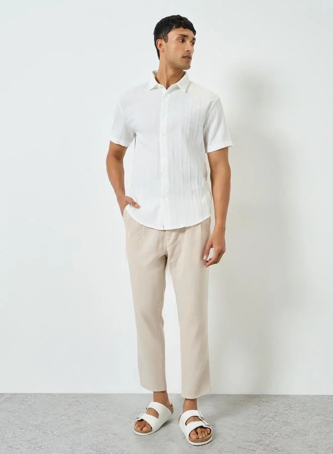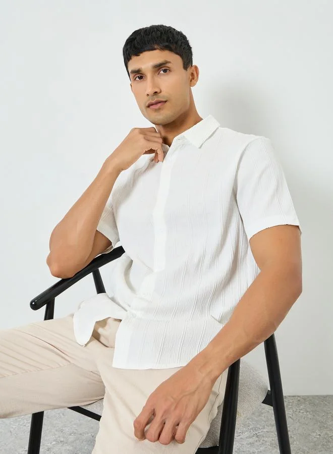 Elevate your casual collection with this crisp white shirt, featuring a distinctive seersucker-style texture for a modern touch. Crafted from durable woven polyester in a comfortable regular fit, it includes short sleeves and a curved hemline. Ideal for daily wear or smart-casual outings, this versatile piece pairs effortlessly with chinos or shorts.