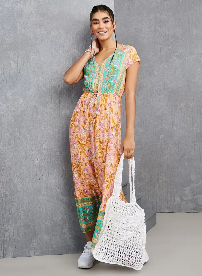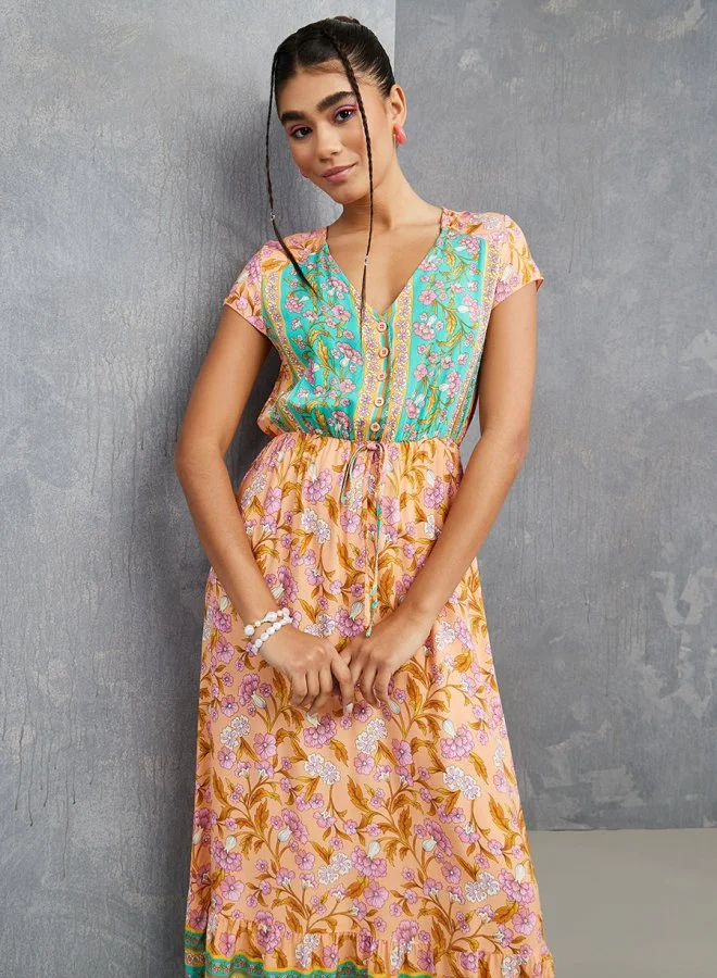 Take Two Short Sleeves V Neck Bohemian Ruffle Hem Midi Dress