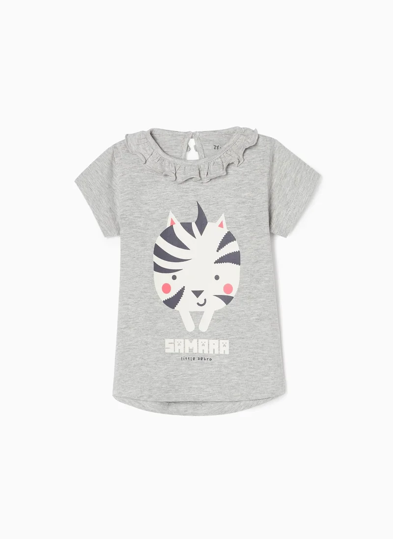 Grey short sleeve t-shirt for baby girls, 100% cotton. Frill collar. Front print. Button fastening at the back for easy dressing. Printed inner label so as not to irritate the skin. A soft and comfortable t-shirt with a lovely character: a zebra called Samara.