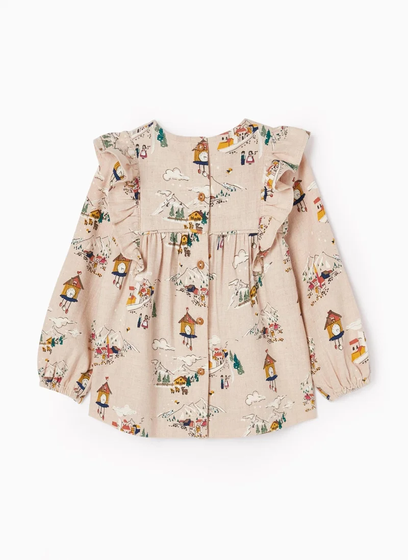 Beige tunic for baby girls with cuckoo and mountain pattern. Made of thick cotton blend fabric. With a button at the back for easy dressing. Ruffles at the shoulders and elasticated cuffs. Flared effect. A classic and timeless piece with an original and lovely pattern.