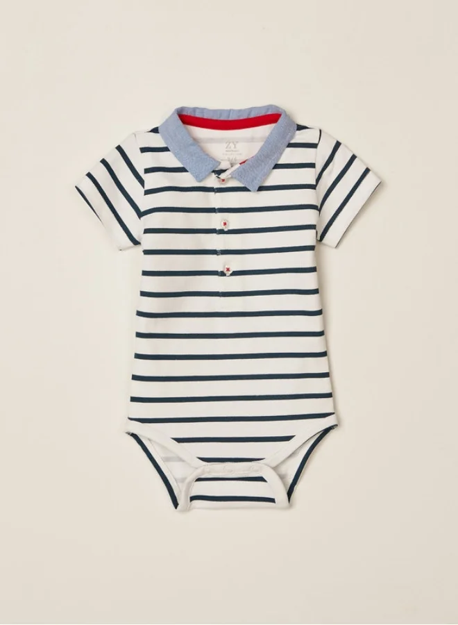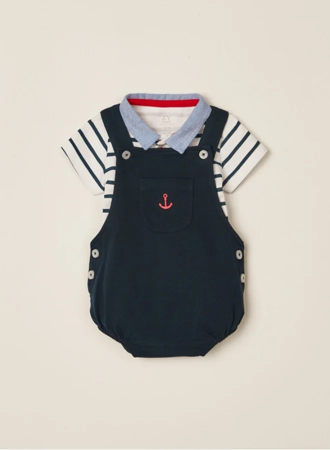 Set for newborn baby boys. Dungarees with adjustable criss-cross straps. Pocket on the chest and buttons on the sides. Crotch with hidden snap fasteners for easy nappy changing. Elasticated hem for a better fit.