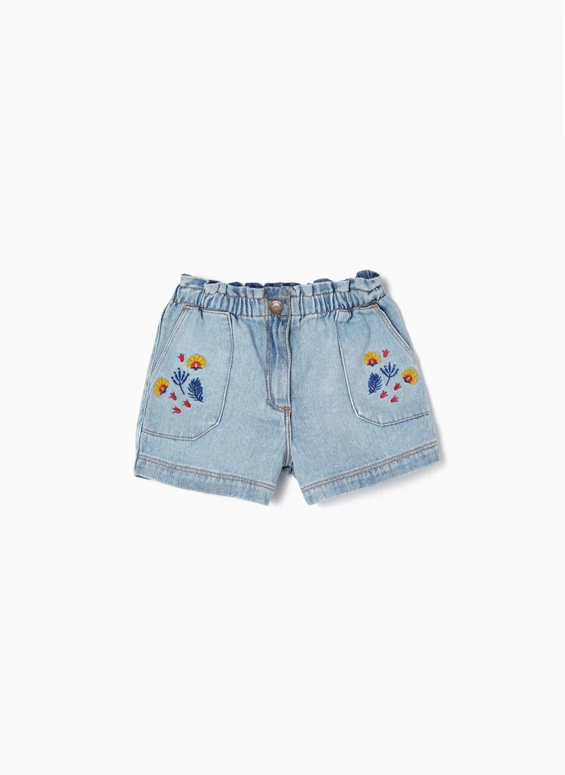 Denim shorts for baby girls in 100% cotton denim. Floral front embroidery. Fastens at the front with press stud and zip. Adjustable inner waistline with buttons and elastic bands. Two pockets. A perfect and essential piece for any style or occasion.