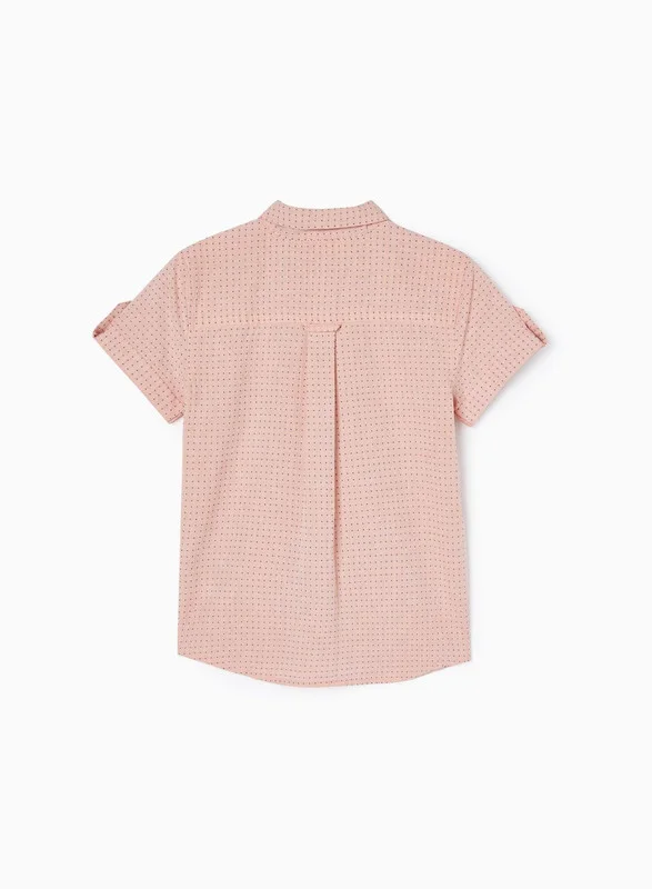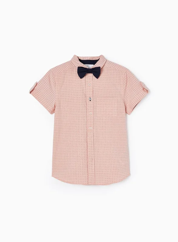 Two-piece set for boys, 100% cotton. Includes a coral short-sleeved shirt, with polka dots, texture and chest pocket; and a dark-blue, elasticated and adjustable bow tie; The ideal option for events, parties and ceremonies, either for a more casual or classic look. Big Me: Different colour button and buttonhole, so children can easily identify where to fasten, encouraging their autonomy.