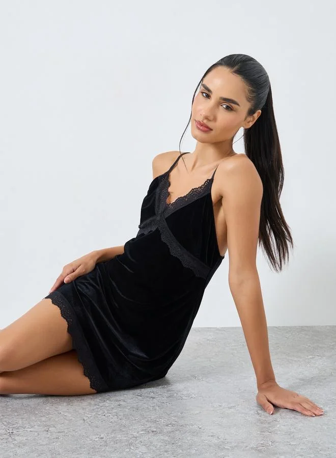 قميص نوم مخمل بتفاصيل دانتيل وحافة بنمط صدف