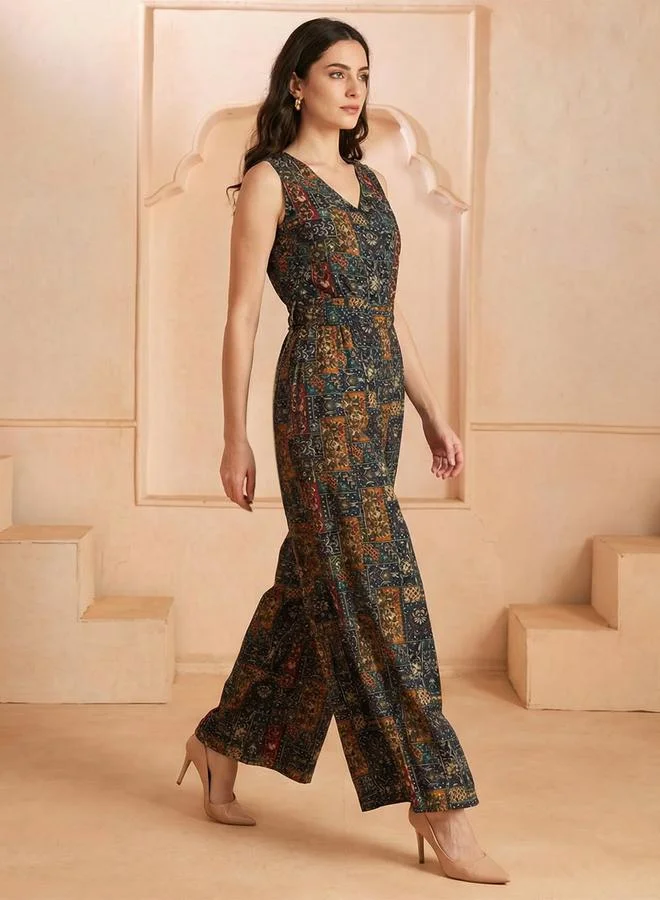 globus Multi Ethnic Print Belted Fusion Wide Leg Jumpsuit
