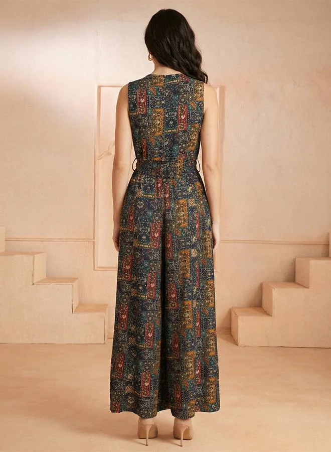 Multi Ethnic Print Belted Fusion Wide Leg Jumpsuit
