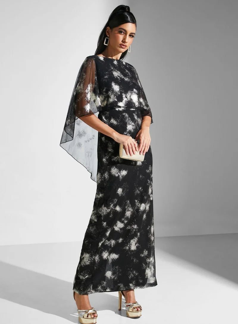This full length maxi dress features an abstract white pattern over a sheer black overlay, with a cape-like detail at the shoulders for added elegance.