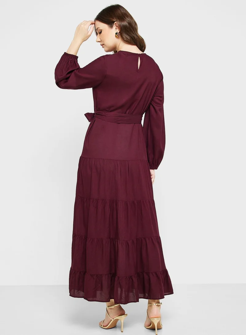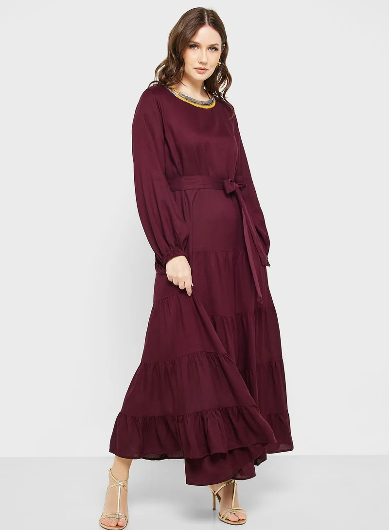 This dark red dress features a crew neckline with a delicate beaded trim and long sleeves. It's designed with a tie waist and a long tiered, ruffled skirt for a bohemian flair.