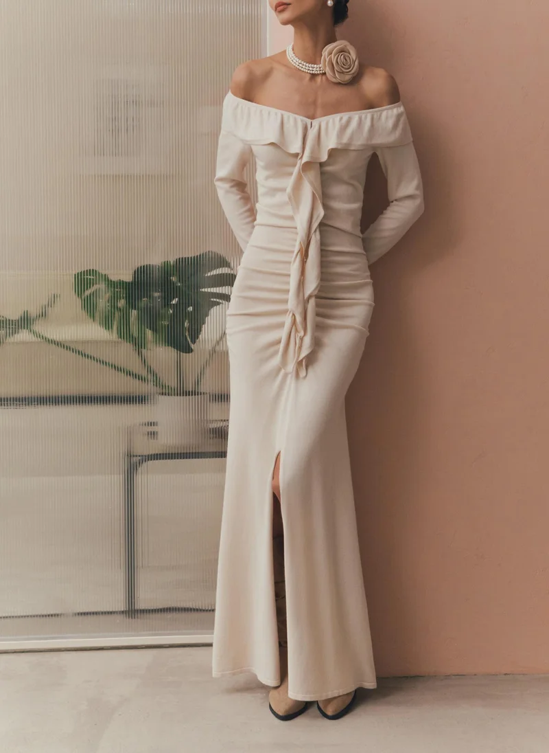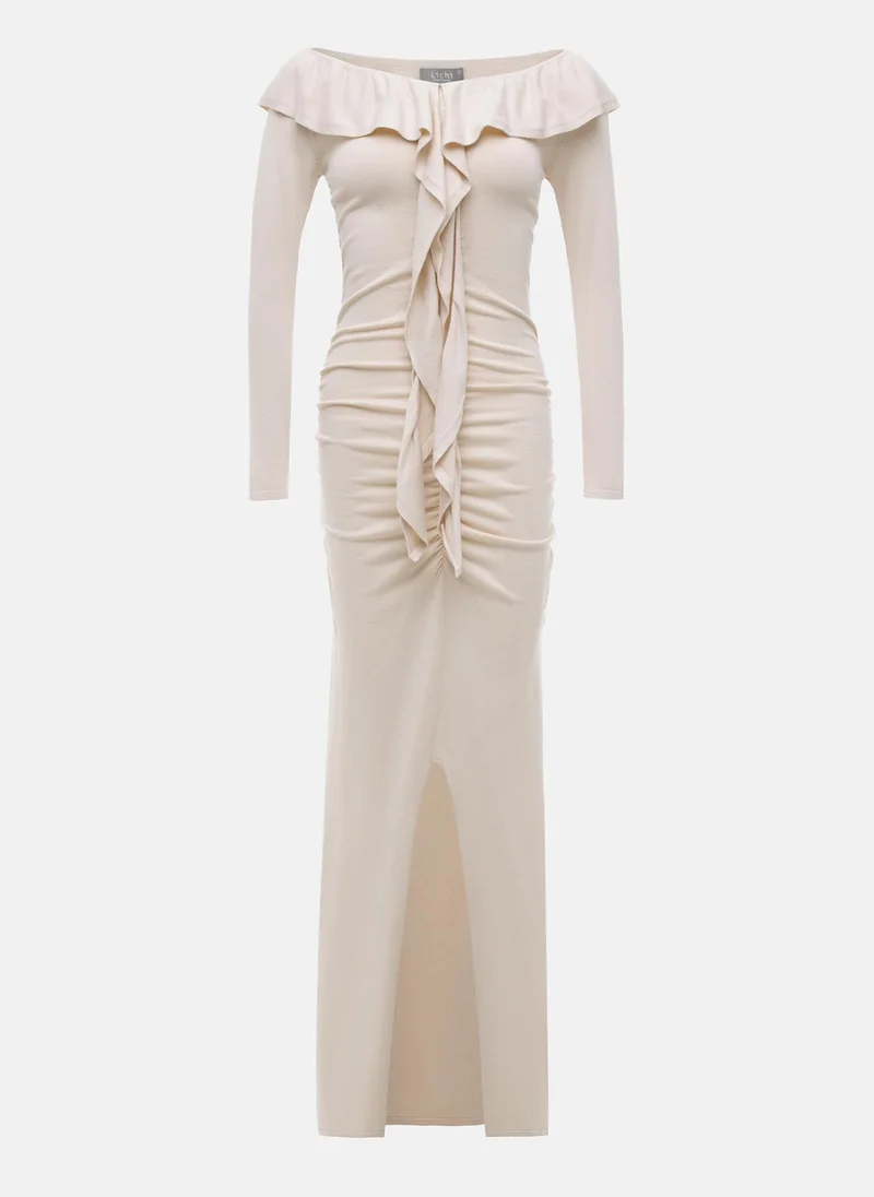 Spectacular maxi dress of a fitted silhouette with a deep V-neckline, which reveals the shoulders and emphasises the neckline, as well as fitted long sleeves and a straight skirt with a high slit. The dress has small gatherings on the side seams, making it drape in the front, and is complemented by voluminous flounces on the collar and bodice.- maxi length- fitted silhouette- V-neckline- flounces on the collar- long sleeves- straight skirt with a slit- concealed zip fastening