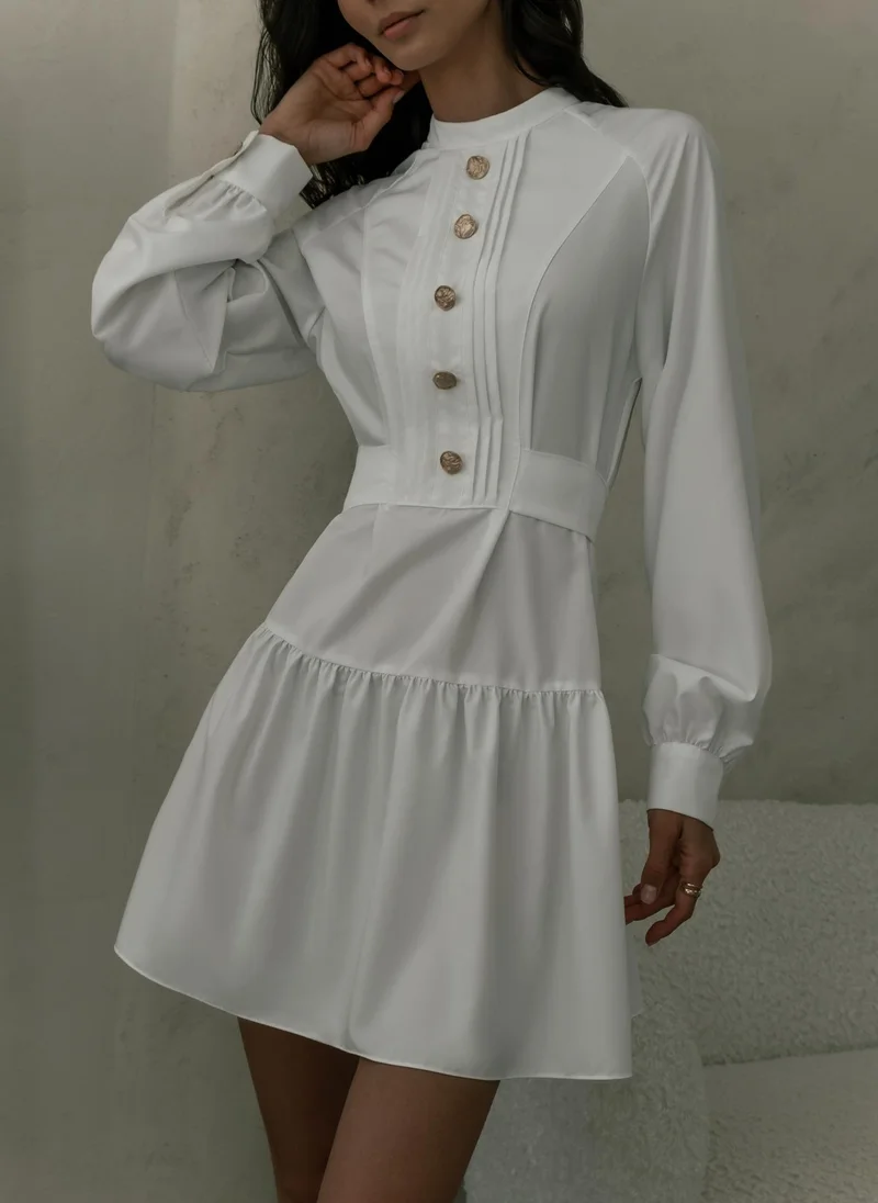 This white dress features a high neckline and long sleeves, with decorative gold buttons down the bodice and a defined waist. The dress has a tiered skirt that falls to mid-thigh length.