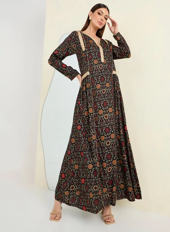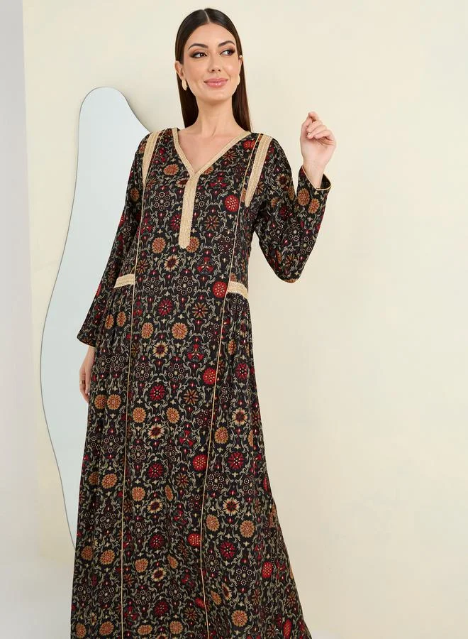 Maxim Creation Vintage Print Jalabiya with Gold Trim by Styli