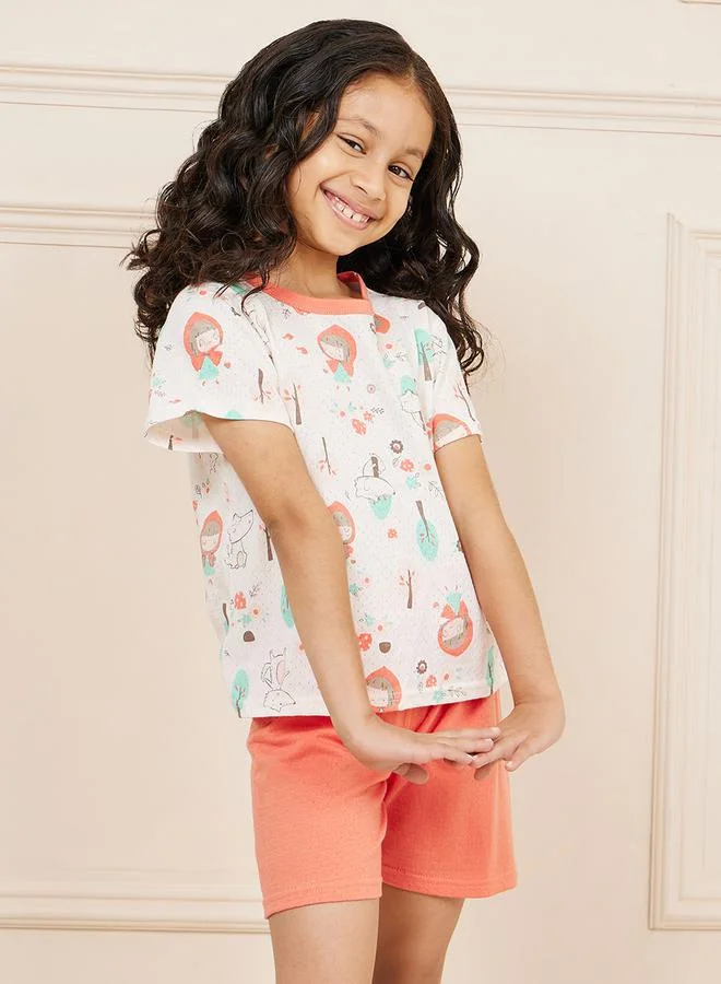 All Over Cartoon Print T-Shirt & Solid Shorts Set