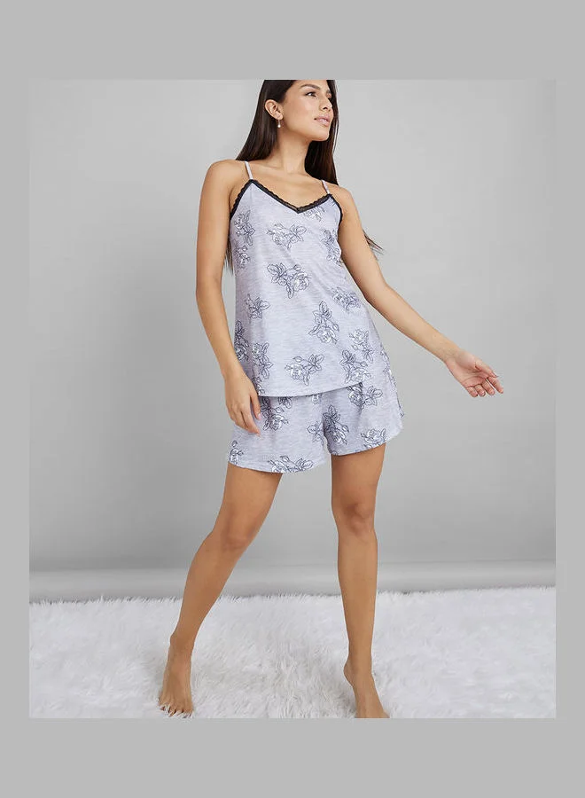 Styli AOP Sketchy Floral Lace Trim Cami and Shorts Set