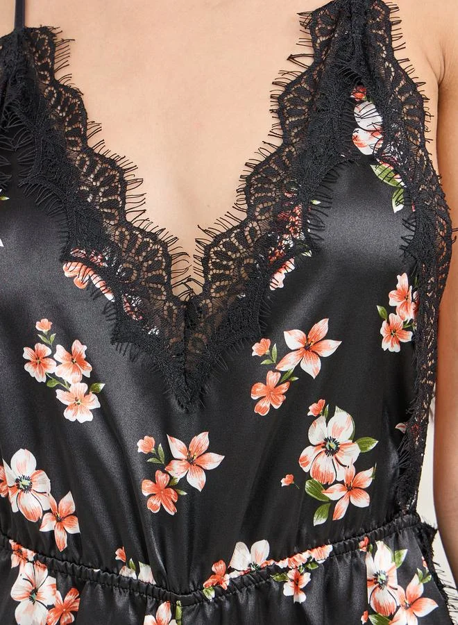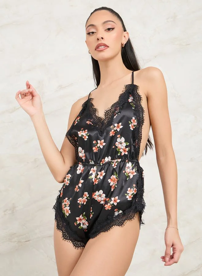 Styli Eyelash Lace Trim All Over Floral Print Teddy