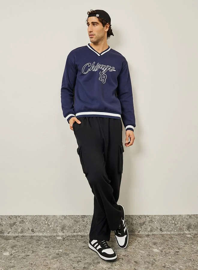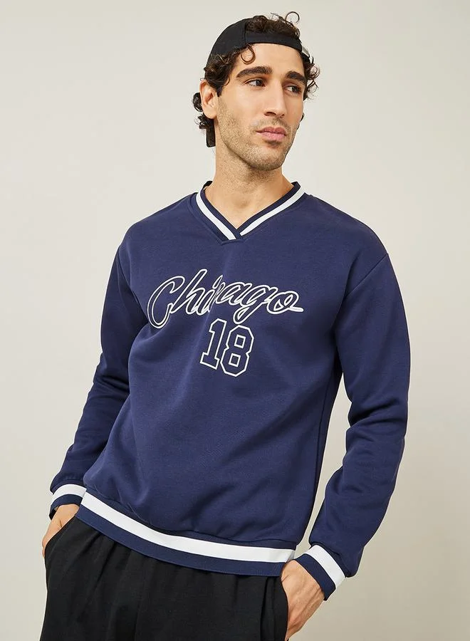 Styli Graphic Print V Neck Ribbed Varsity Sweatshirt