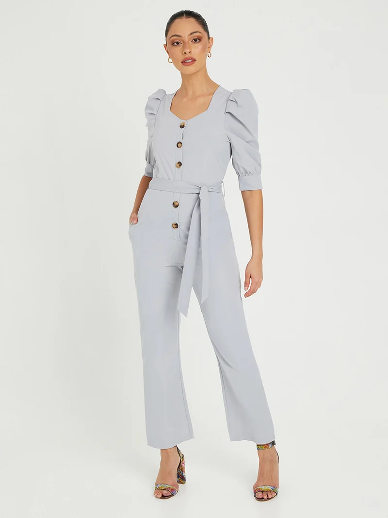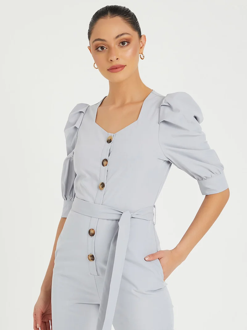 Styli Puff Sleeves Button Closure Straight Leg Jumpsuit
