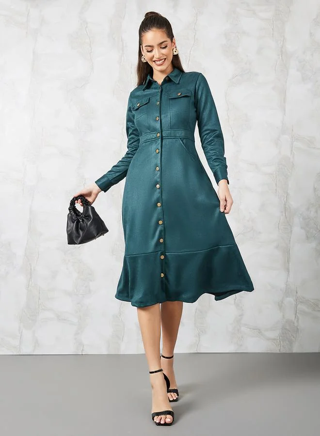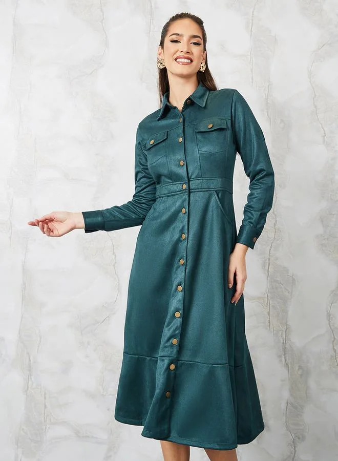 Styli Suede Look Shirt Midi Dress with Buttons
