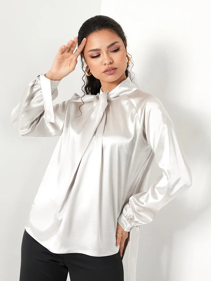 Tie Cuff Long Sleeves Satin High Neck Blouse