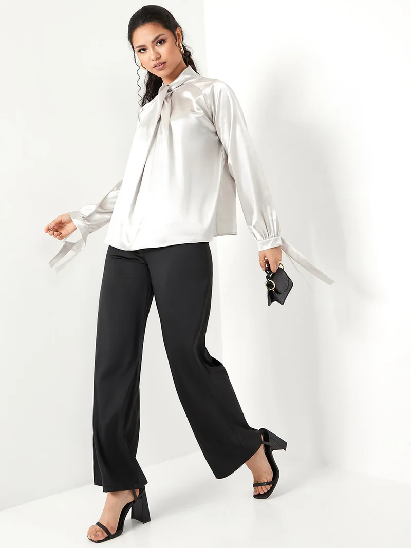 Styli Tie Cuff Long Sleeves Satin High Neck Blouse
