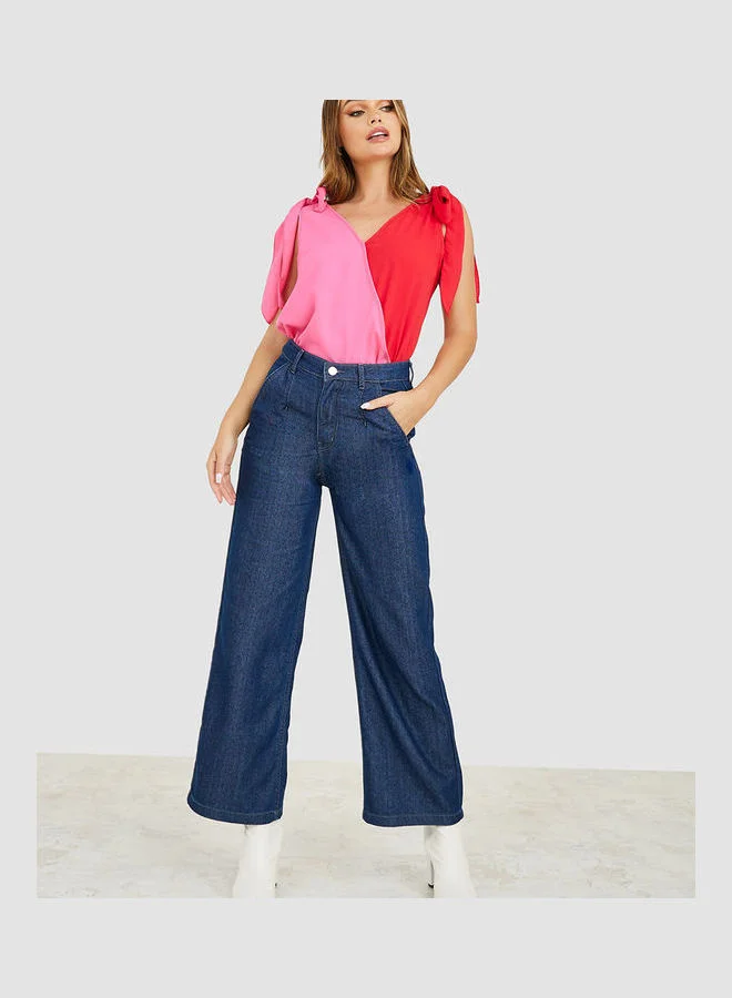 Styli Tie Up Shoulder Sleeve Colorblock Regular Fit Blouse
