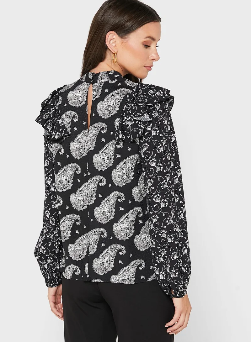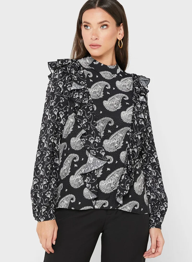 This printed top is a dazzling, versatile addition to the collection of feminine masterpieces.