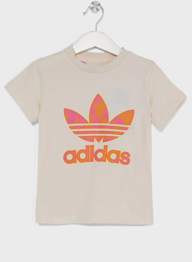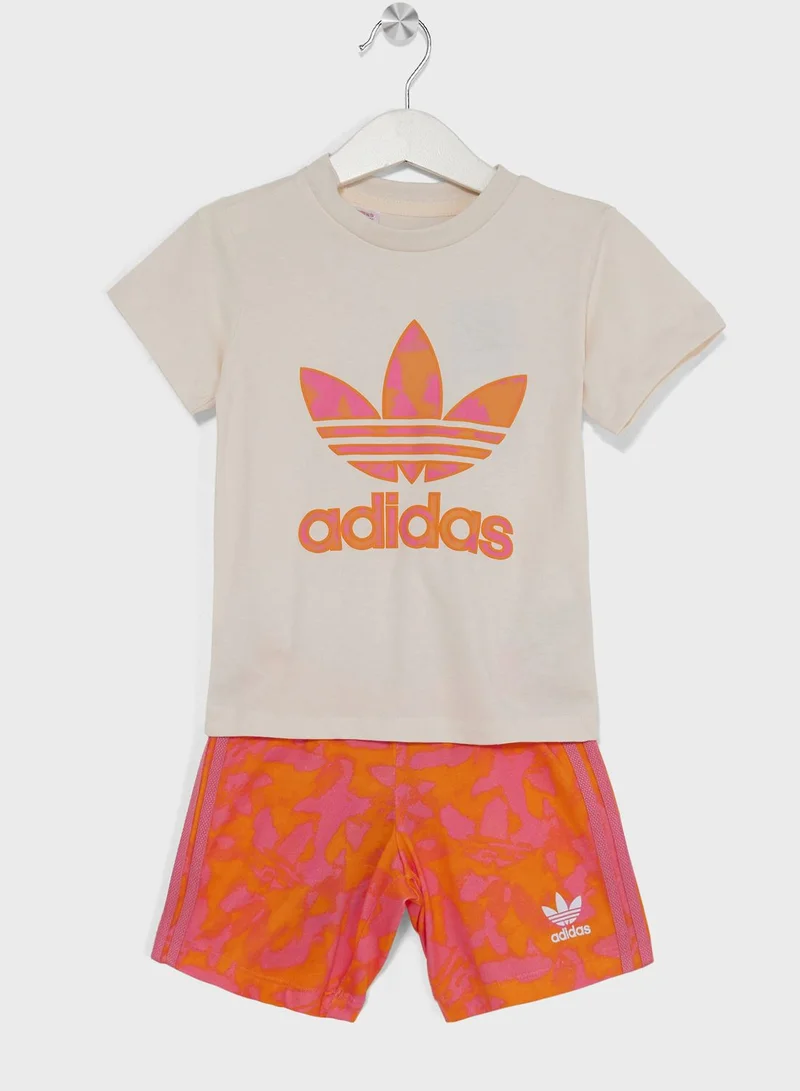 • adidas Originals trefoil and signature branding print at front of t-shirt and shorts