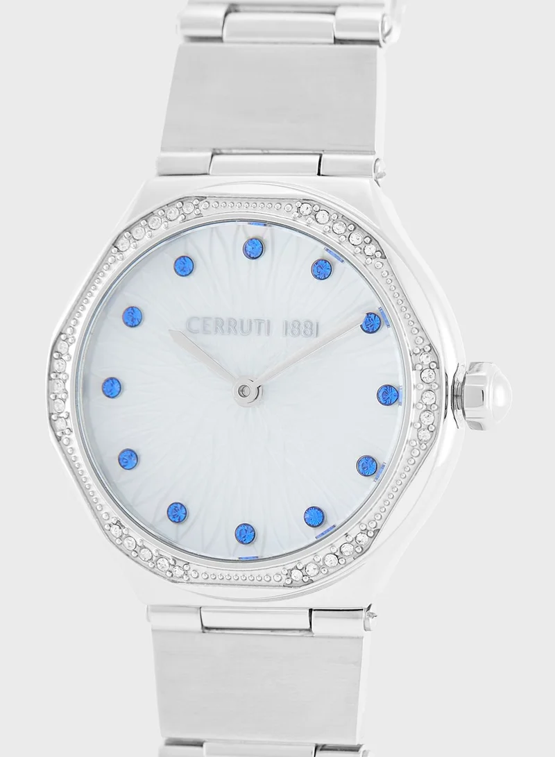 • Crafted from stainless steel and silver, its polished case is complemented by a silver bezel adorned with elegant crystal stones