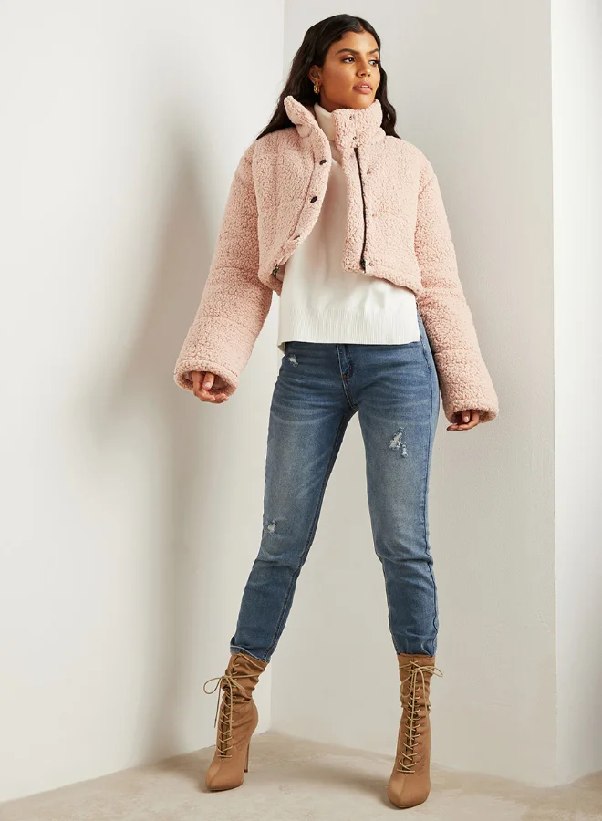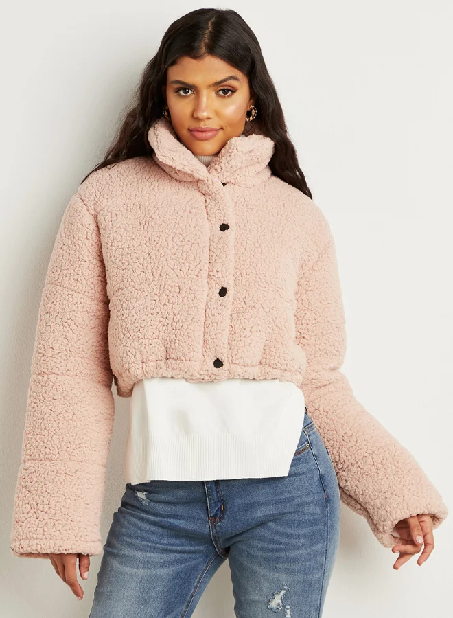 Closet By Styli Cropped Faux Teddy Puffer Jacket Pink