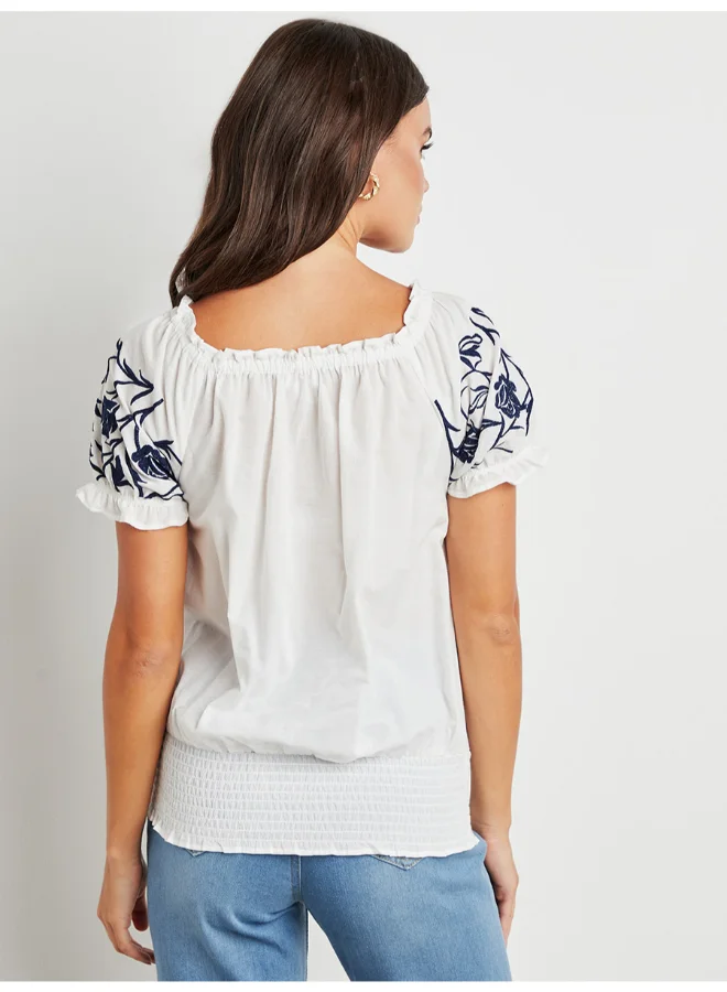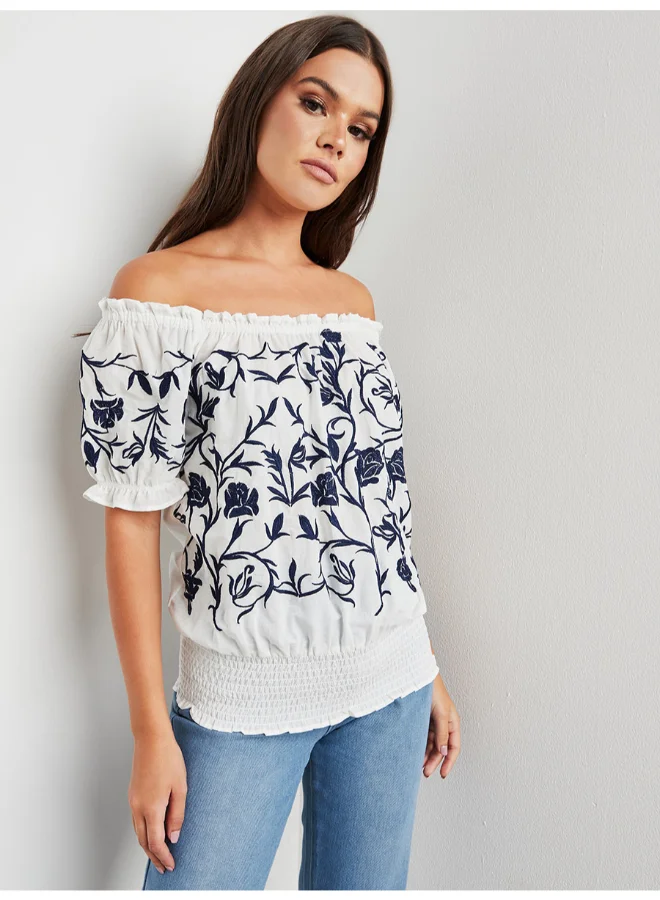 Closet By Styli Embroidered Off Shoulder Shirred Hem Top White/Blue