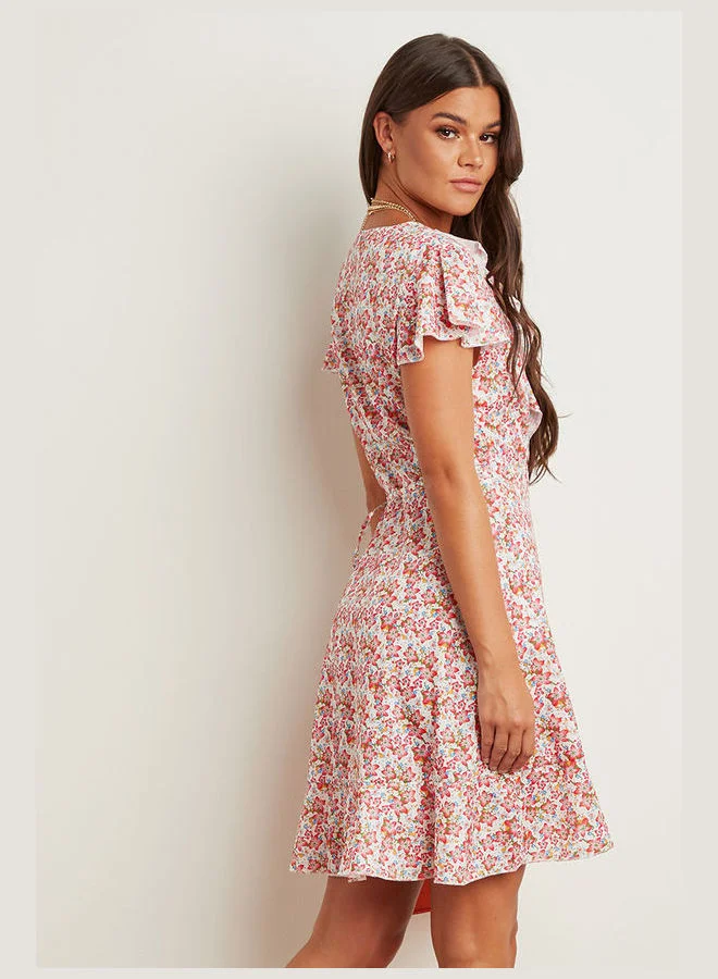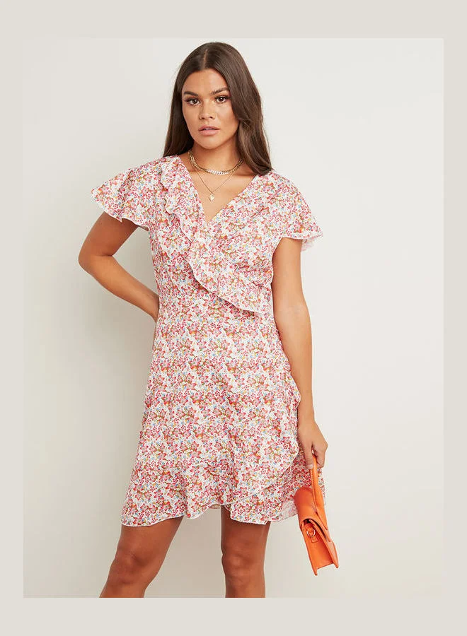 Closet By Styli Floral Printed Wrap Over Skater Mini Dress Multicolour