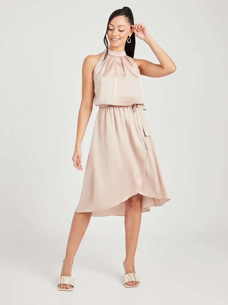 Closet By Styli Halter Neck A-Line Midi Dress Beige