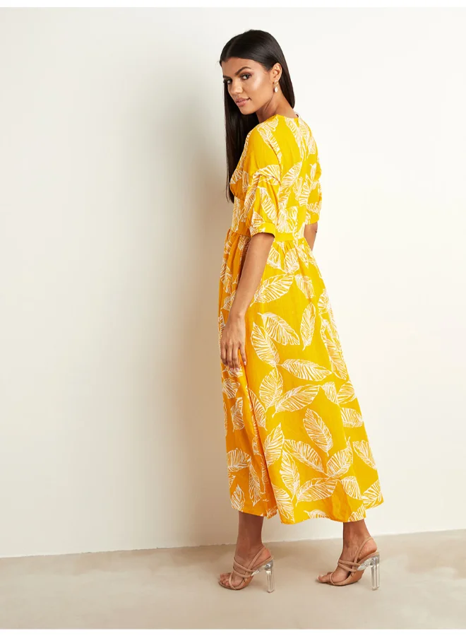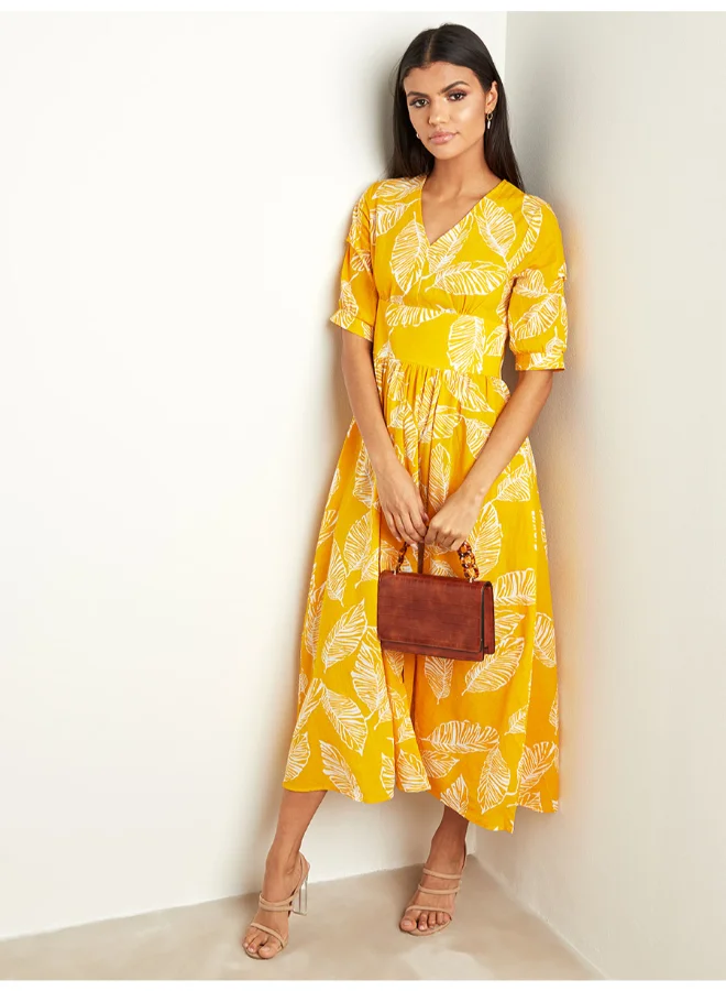 Closet By Styli Leaf Printed V-Neck A-line Midi Dress Mustard