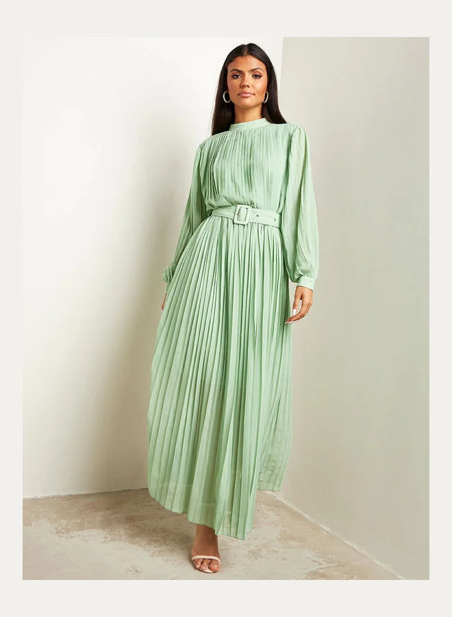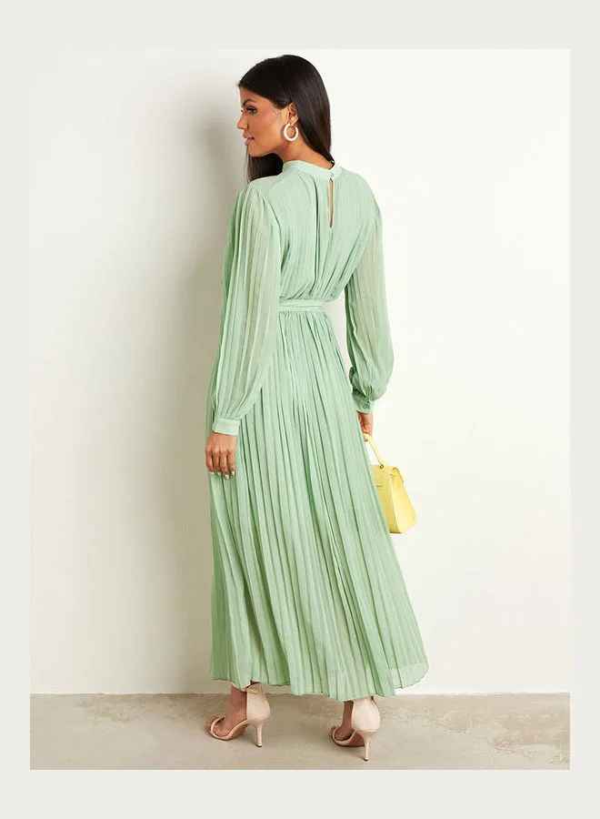Closet By Styli Pleated Long Sleeve Belted Maxi Dress Green
