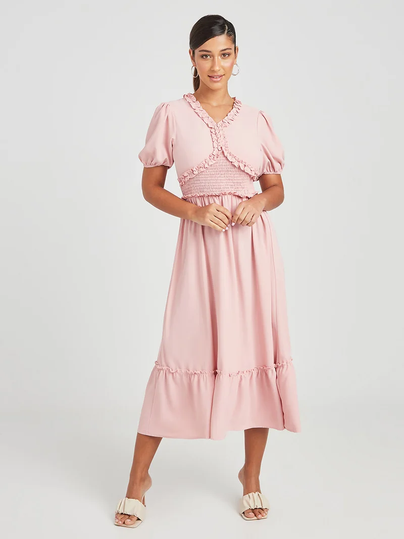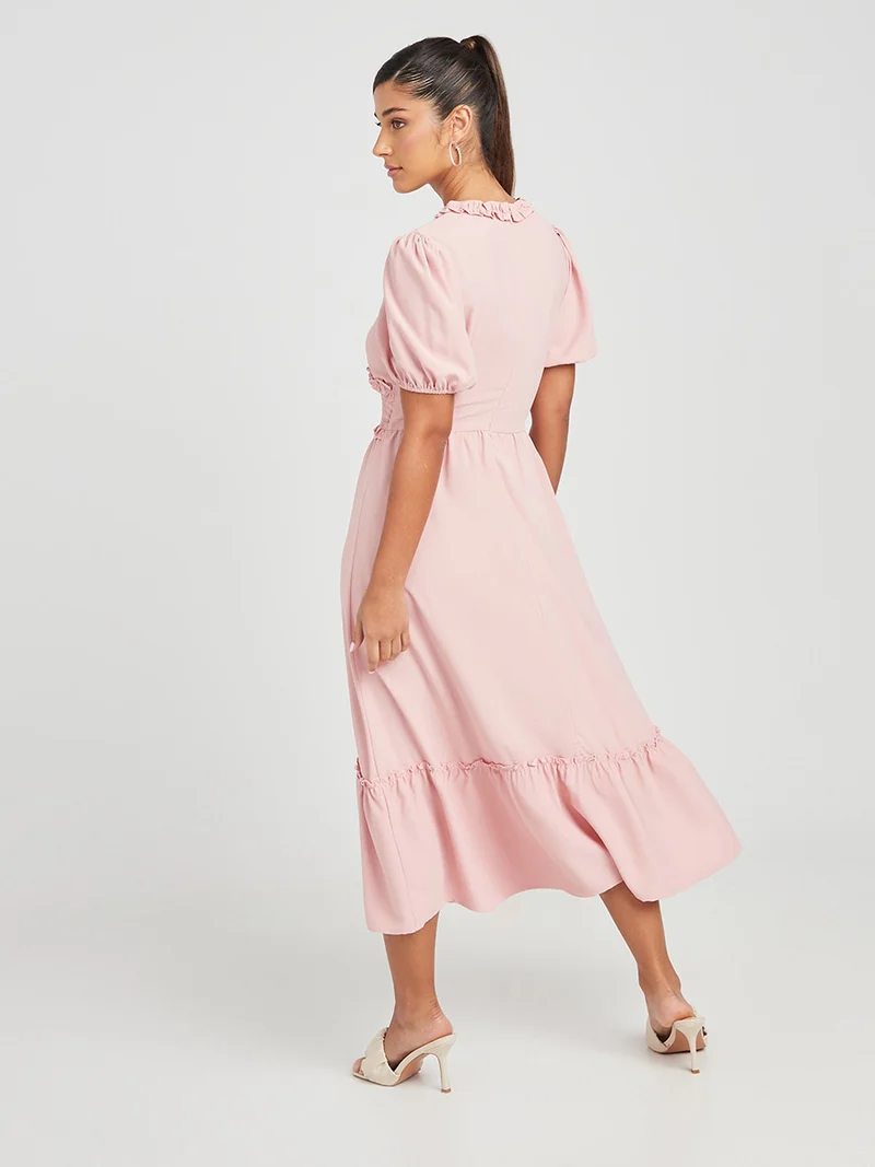 Closet By Styli Puff Sleeves Ruffle Detail Woven A-Line Midi Dress Pink