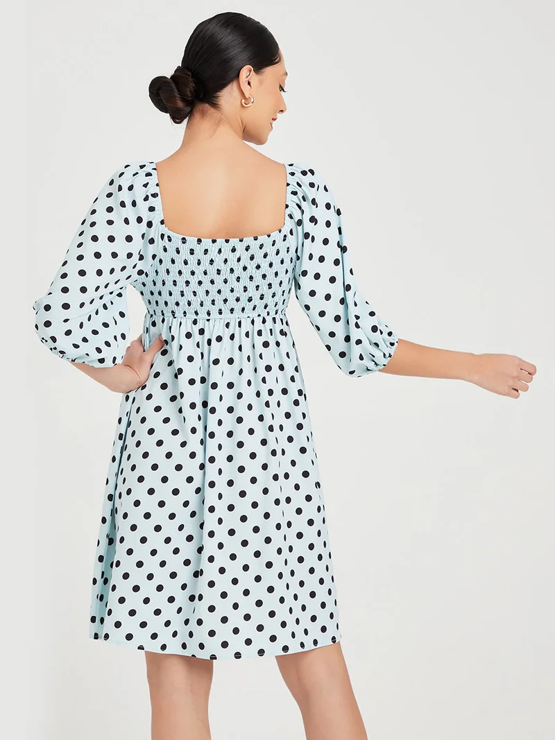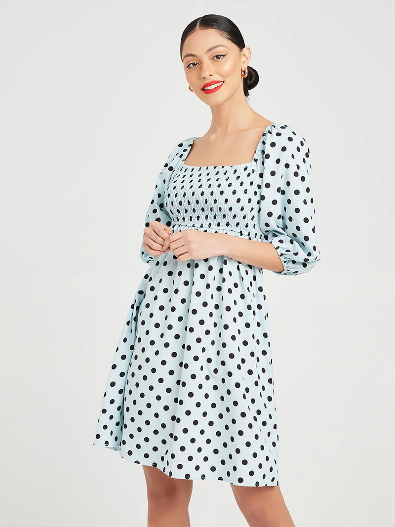 Shirred Detail Polka Dot Smock Mini Dress Blue/Black