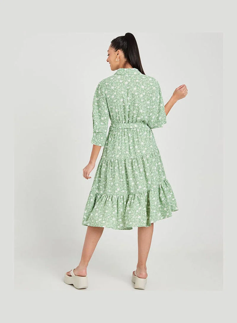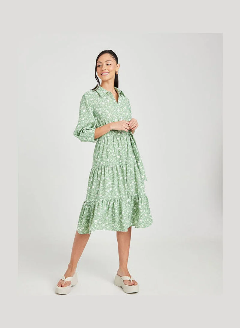Closet By Styli Three-Quarter Sleeves Collar Neck Floral Print Tiered Midi Dress Green