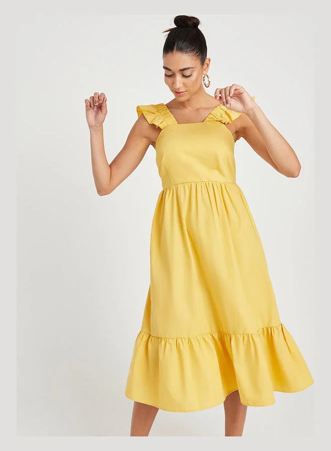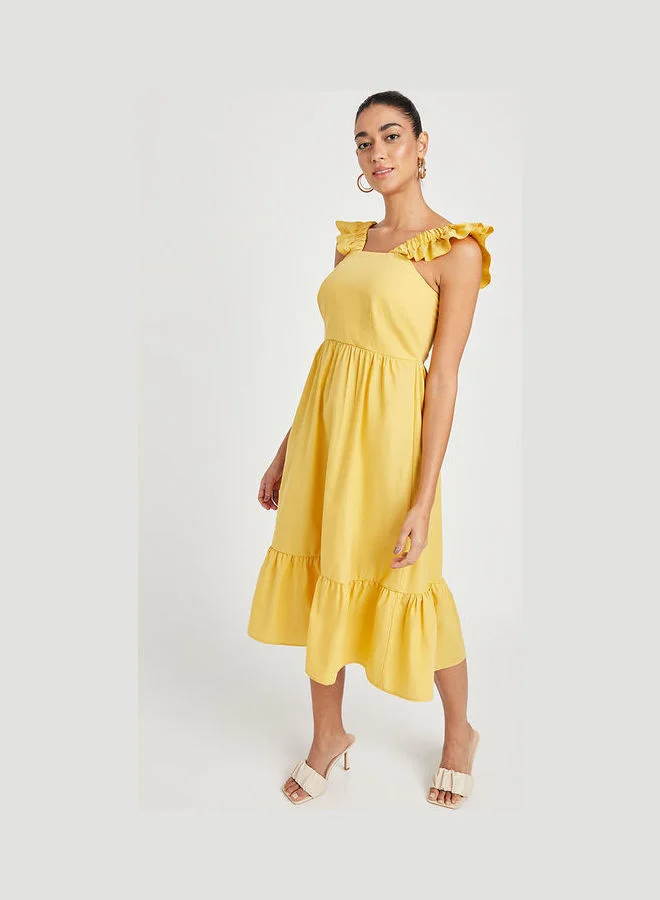 Closet By Styli Tiered Ruffle Sleeve A-Line Midi Dress Mustard
